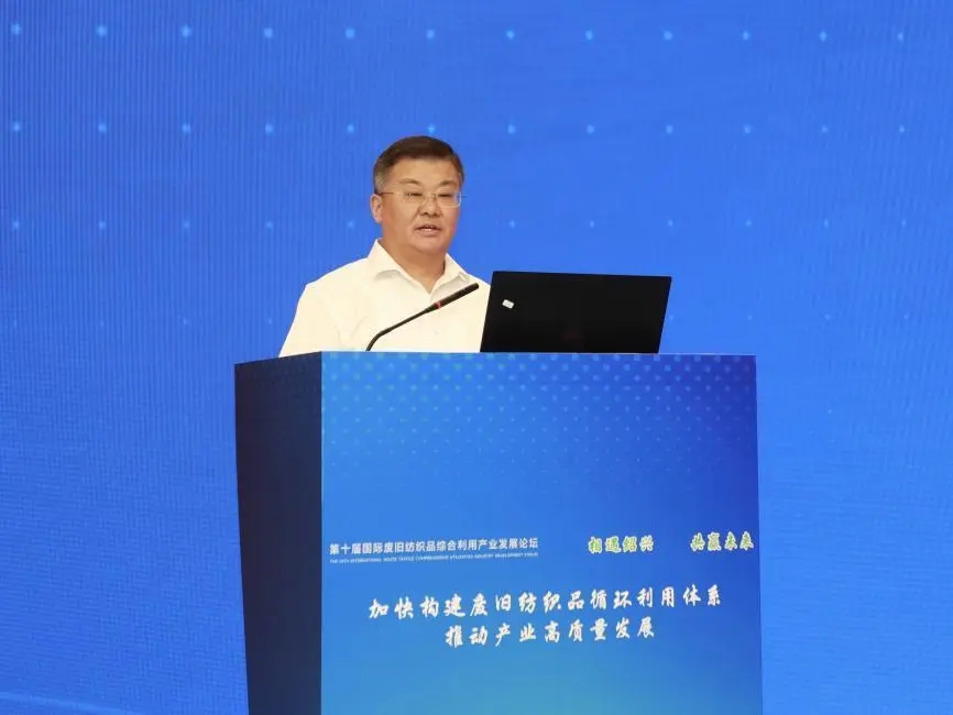 何炳光作题为《加快构建废旧纺织品循环利用体系,助力碳达峰碳中和》的主旨报告,他指出,习近平总书记多次就发展循环经济发表重要讲话,强调废弃物是放错位置的资源,发展循环经济是提高资源利用效率的必由之路。要从提高回收利用水平、加快技术开发应用、建立健全标准体系、研究落实政策等方面加快推动实施意见和行动方案落地生效。